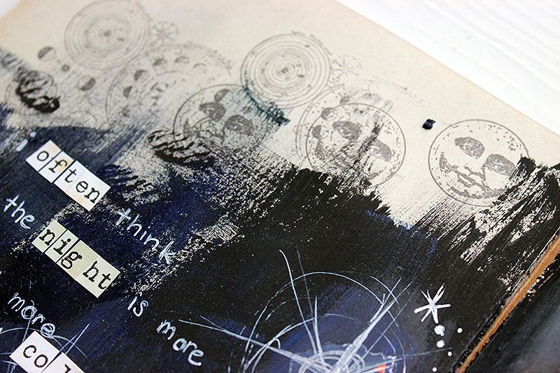 Before adding my cut-out elements to the journal, I added some black gesso and sparkly acrylic paint to the page. Very appropriately the name of the paint was “Night Sky”. Then I used Soft Matte Gel as my adhesive and adhered the collage elements in place. I added some stamping here and there using the “Dream Without Fear” set and then doodled some stars using paint markers.