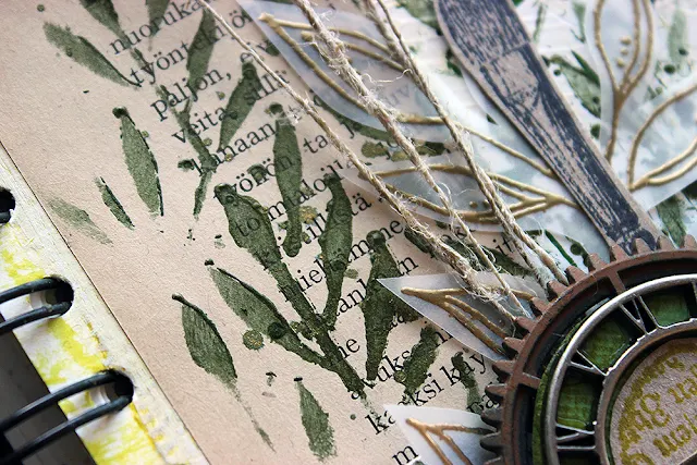 I started the page with a crackle paint layer. There’s olive green paint underneath a crackled layer of white – this represents winter. Like new plants and life is waiting underneath the snow and ice. The spring is the sprouts shooting up towards the sky in the background, done using metallic olive green paint. Summer is the patterned blue paper with delicate flowers on it. The golden embossed leaves on vellum and the brown, rusty Mechanical leaves echo the wildering plants of autumn.