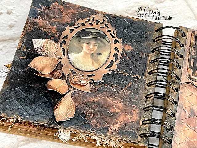 The first thing that came to my mind when thinking about the theme was elegance, rich, deluxe images so I decided to make a unique spread working with pearly black and Copper together with a vintage image and a quote: "Art is not Luxury is a necessity"