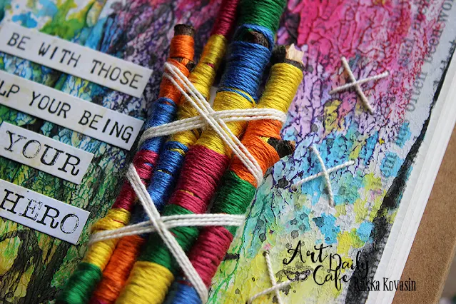For the sentiment I combined a couple of different ones from the Art Daily sticker pad. I love making little stories like this – using word stickers or cut out words from old books. This time the story is more like a guideline than a story: “Be with those who help your being your own hero”.